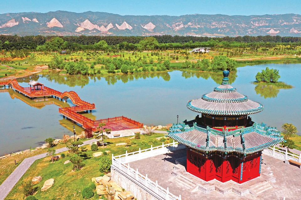 6月13日,在太原汾河景區(qū)四期工程望岳閣畔,一座木結(jié)構(gòu)景觀橋猶如江南水鄉(xiāng)景色,連廊臥波于汾河之上,為長達(dá)十公里的汾河四期工程增添了浪漫畫卷。(記者劉通攝)