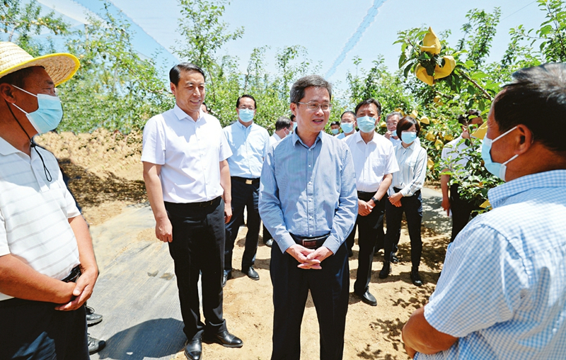 6月14日,省委副書記、省長、省總河長藍佛安來到吉縣柏山寺鄉(xiāng)“雙千畝”蘋果高新示范基地,與專業(yè)果樹種植戶親切交談,詳細了解基地建設(shè)及生產(chǎn)營銷開發(fā)等情況。 本報記者李兆民攝