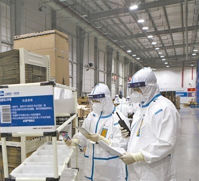 因?yàn)檫M(jìn)口藥品的物流是冷鏈物流,按照嚴(yán)格的衛(wèi)生要求,我們換上白色防護(hù)服,戴上防護(hù)面屏、一次性手套、N95口罩,經(jīng)過(guò)掃碼、測(cè)溫,一起進(jìn)入了保稅倉(cāng)。