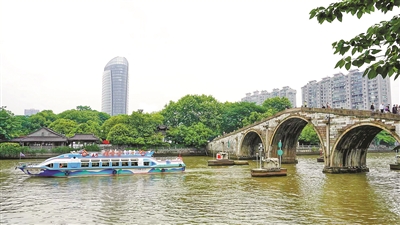 兩艘船2022年3月底進(jìn)廠,改造前后經(jīng)歷兩個多月,杭州水上發(fā)展集團有限公司相關(guān)負(fù)責(zé)人說:“為了更好地發(fā)揮運河游船的文化特色優(yōu)勢,我們緊扣‘中國新時代、杭州新亞運’的目標(biāo)定位,精心改造升級了兩艘水上巴士。”水上巴士還是亞運特許零售點,游客在船上可購買到心儀的亞運紀(jì)念品,船舶運營過程中還會途經(jīng)亞運會吉祥物“宸宸”的原型——拱宸橋,兩岸的市民游客還可與亞運特色船、拱宸橋來個合影。