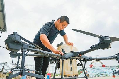 中江縣金穗源糧食專業(yè)合作社理事長(zhǎng)常滔在做無(wú)人機(jī)起飛前的準(zhǔn)備工作。四川日?qǐng)?bào)全媒體記者 李強(qiáng) 攝