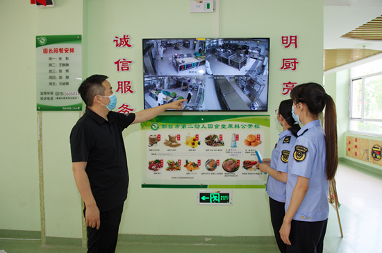 邢臺(tái)市市場(chǎng)監(jiān)管部門執(zhí)法人員到邢臺(tái)市第二幼兒園檢查“明廚亮灶”情況。 陳克家攝