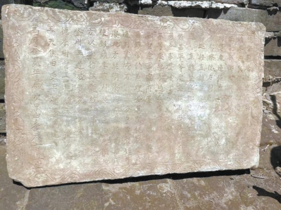 “發(fā)現(xiàn)一塊石碑,出土?xí)r碑文一面向下,推測(cè)這塊石碑原來(lái)鑲嵌在北側(cè)垛口墻內(nèi)側(cè),墻體傾斜倒塌后,石碑脫落?!表?xiàng)目考古負(fù)責(zé)人、北京考古研究院副研究員尚珩介紹。石碑為青石材質(zhì),保存完整,邊框刻著纏枝卷草紋。因?yàn)槊撀鋾r(shí)碑文面朝下,因此碑文保存完好,字體為繁體字,字跡娟秀,清晰可辨。