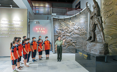 7月6日,在江蘇省泰興市新街鎮(zhèn)楊村廟烈士紀(jì)念館,少先隊(duì)員在宣泰戰(zhàn)斗浮雕前聽(tīng)講解員講解。顧繼紅攝(影像中國(guó))