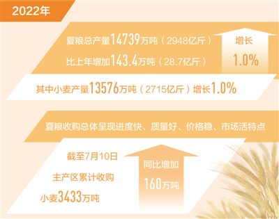 國家統(tǒng)計局7月14日發(fā)布數據顯示:2022年全國夏糧總產量14739萬噸(2948億斤),比上年增加143.4萬噸(28.7億斤),增長1.0%。其中,小麥產量13576萬噸(2715億斤),增長1.0%。