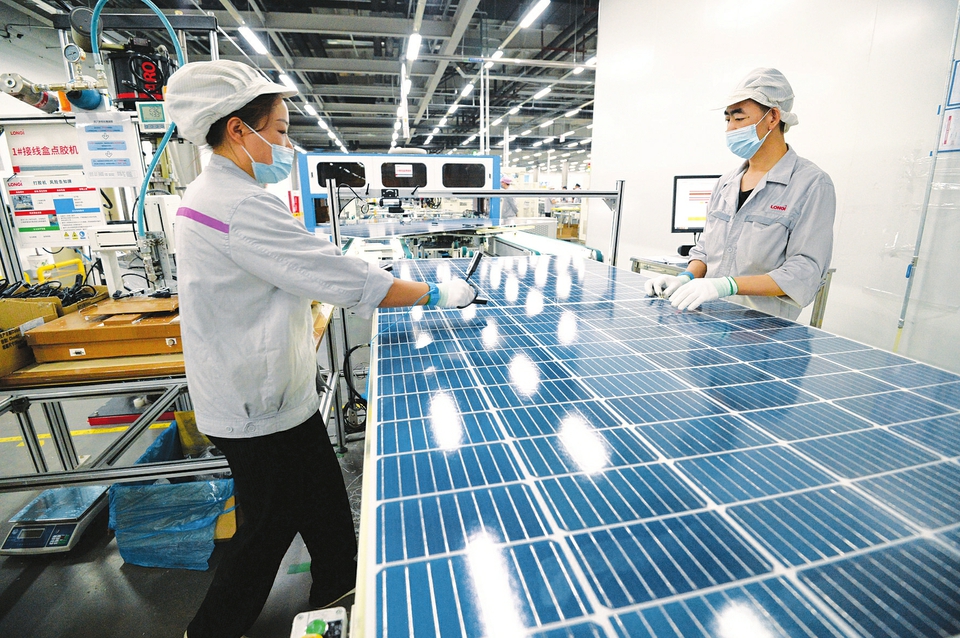 7月15日,大同隆基光伏科技有限公司光伏面板生產(chǎn)線上,工人們正在對(duì)產(chǎn)品進(jìn)行最后檢測(cè)。該公司規(guī)劃布局了3條自動(dòng)化生產(chǎn)線,引入目前行業(yè)內(nèi)先進(jìn)的生產(chǎn)設(shè)備和技術(shù)工藝。全部建成投產(chǎn)后,預(yù)計(jì)年產(chǎn)值約30億元。(記者李兆民攝)