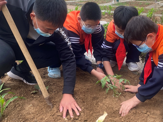 河北省威縣第五中學(xué)教育集團(tuán)師生在勞動(dòng)教育實(shí)踐基地移栽西紅柿植株。 趙國(guó)華攝