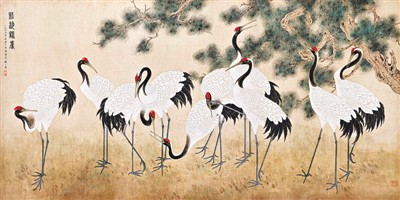 《松齡鶴壽圖》是陳之佛工筆花鳥中尺幅較大的一幅,是為慶祝中華人民共和國成立十周年的獻(xiàn)禮作。10只體態(tài)優(yōu)雅的丹頂鶴,安逸地徜徉于大地之上,或昂首唳天,或回首顧盼,或凝神遠(yuǎn)眺,蒼翠的古松由畫面右上方伸入,枝干蒼勁古樸,松枝郁郁蔥蔥,蘊(yùn)含著無限生機(jī)。陳之佛在中國畫傳統(tǒng)線描基礎(chǔ)上,將西洋畫和裝飾畫的線條加以改造后融入其中,使線條的表現(xiàn)力更為豐富。