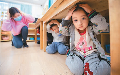 圖四:江蘇省南京市雨花臺(tái)區(qū)龍福幼兒園小朋友們學(xué)習(xí)防災(zāi)減災(zāi)自救技能。蘇陽(yáng)攝(人民視覺(jué))