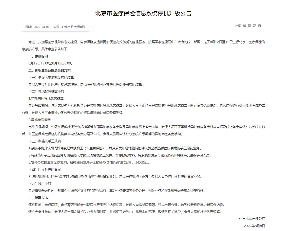 北京醫(yī)保信息系統(tǒng)將停機(jī)升級(jí) 部分醫(yī)保業(yè)務(wù)暫緩辦理