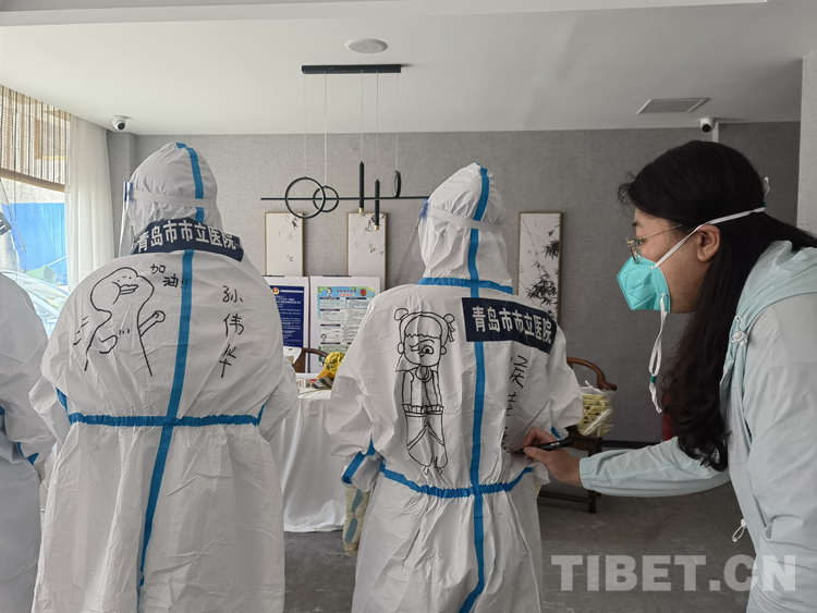 中國西藏網(wǎng)訊 青島援藏醫(yī)療隊自8月17日進藏以來, 隊員們無論工作多累多難、高原反應有多難受,都沒有一句怨言,依然堅持在西藏自治區(qū)日喀則市戰(zhàn)“疫”一線。工作之余,來自青島市市立醫(yī)院本部ICU的鐘翔宇發(fā)揮出了她的“隱藏技能”——在醫(yī)療隊的“大白”身上畫上漫畫,用表情包背到身上的方式給隊友們加油鼓勁兒。身著漫畫“戰(zhàn)袍”的隊員們斗志昂揚,朝氣蓬勃,互相鼓勵幫助,完成了一天天的工作任務(wù)。而這些古靈精怪的漫畫,在戰(zhàn)“疫”一線也成了一道靚麗的風景線。(中國西藏網(wǎng) 記者/次旦拉姆 由桑珠孜區(qū)融媒體中心供稿)