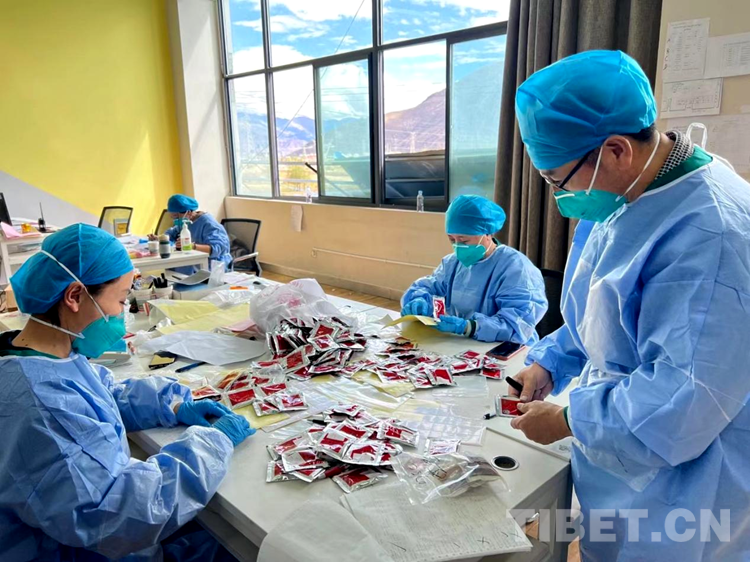 圖為拉薩市第二座方艙醫(yī)院藥劑科醫(yī)護人員們?yōu)樾氯腭v的患者準備藏藥 攝影:次仁卓瑪