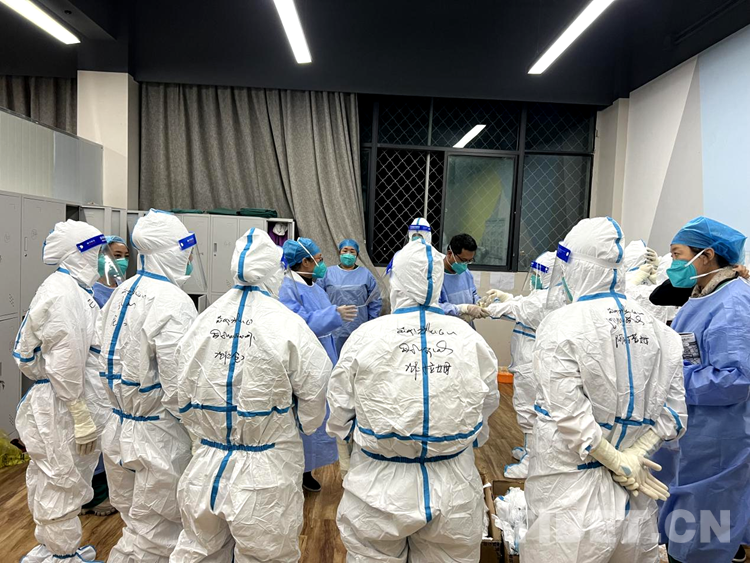 圖為拉薩市第二座方艙醫(yī)院醫(yī)護人員們正在穿防護服準備開始一天的工作 攝影:次仁卓瑪