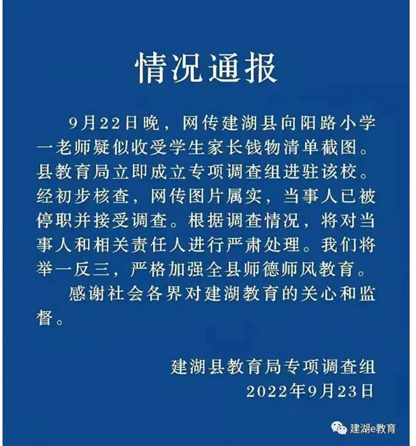 人民網(wǎng)南京9月23日電 (王丹丹)據(jù)“建湖e教育”微信公眾號消息,江蘇鹽城建湖縣教育局專項調(diào)查組發(fā)布情況通報,9月22日晚,網(wǎng)傳建湖縣向陽路小學一老師疑似收受學生家長錢物清單截圖,縣教育局立即成立專項調(diào)查組進駐該校。