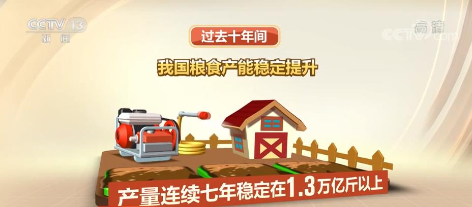過去十年間,我國糧食產(chǎn)能穩(wěn)定提升,產(chǎn)量連續(xù)七年穩(wěn)定在1.3萬億斤以上,十年再上一個(gè)千億斤新臺階。人均糧食產(chǎn)量達(dá)到483.5公斤,高于國際公認(rèn)的400公斤糧食安全線,做到了谷物基本自給、口糧絕對安全。