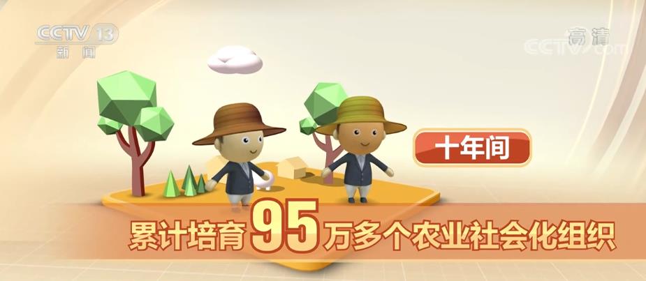 十年間,累計(jì)培育95萬多個(gè)農(nóng)業(yè)社會化組織,服務(wù)面積近17億畝次,服務(wù)帶動小農(nóng)超過7800萬戶。全國農(nóng)作物耕種收綜合機(jī)械化水平從57%提高到72%以上,水稻、玉米、小麥三大糧食作物機(jī)械化率分別超過85%、90%和97%。