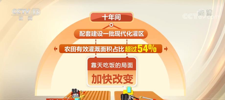 十年間,農(nóng)業(yè)基礎(chǔ)設(shè)施明顯改善,累計(jì)建成9億畝高標(biāo)準(zhǔn)農(nóng)田,配套建設(shè)一批現(xiàn)代化灌區(qū),農(nóng)田有效灌溉面積占比超過54%,靠天吃飯的局面加快改變。
