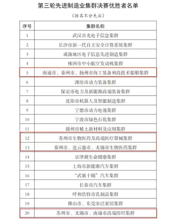 自2019年啟動先進(jìn)制造業(yè)集群培育工作以來,工信部圍繞新一代信息技術(shù)、高端裝備、新材料、生物醫(yī)藥等重點(diǎn)領(lǐng)域,搭建集群間相互比拼的“賽場”。此次江蘇入選的先進(jìn)制造業(yè)集群分別是:南通市、泰州市、揚(yáng)州市海工裝備和高技術(shù)船舶集群,蘇州市生物醫(yī)藥及高端醫(yī)療器械集群,泰州市、連云港市、無錫市生物醫(yī)藥集群,蘇州市、無錫市、南通市高端紡織集群。