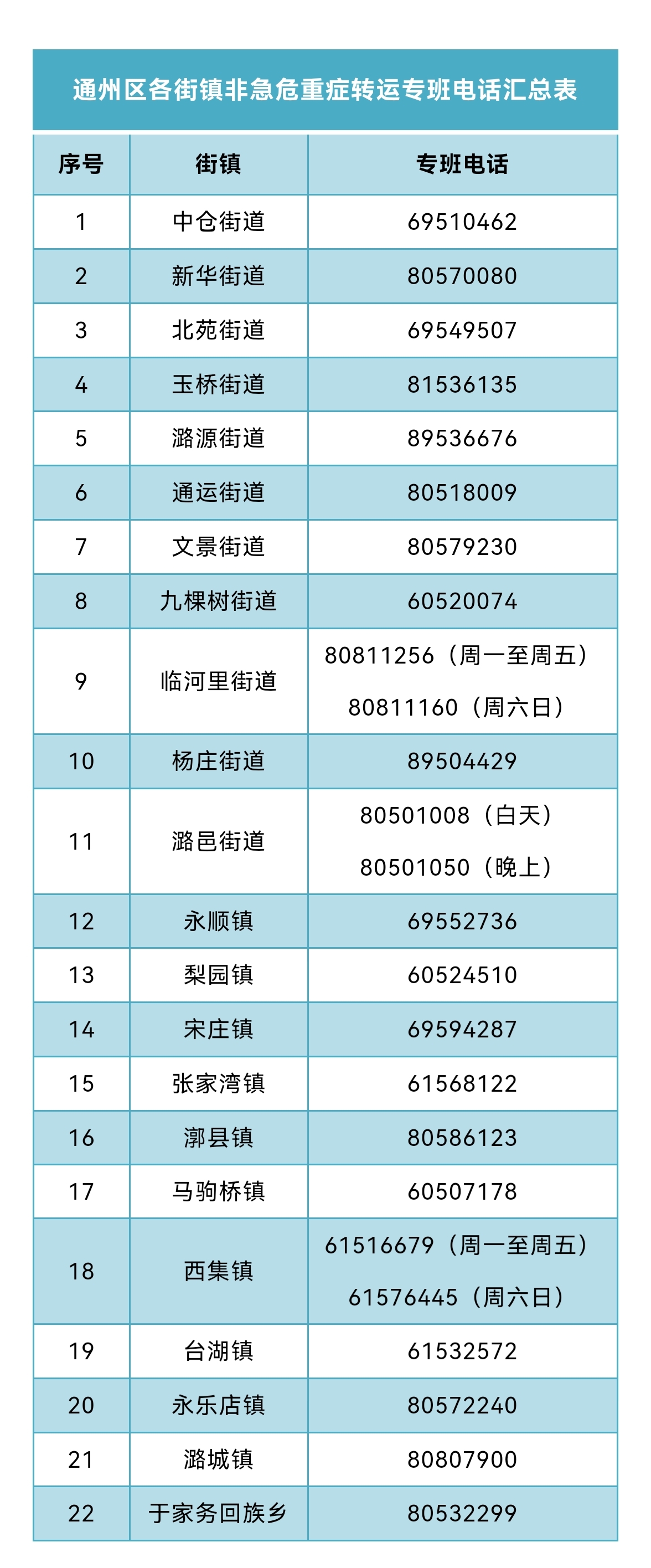 人民網(wǎng)北京12月21日電 為進一步保障非急危重癥群眾就醫(yī)需求,不擠占120醫(yī)療急救資源,暢通就醫(yī)出行通道,將120救護車留給急危重癥患者,北京市通州區(qū)向社會公布各街道鄉(xiāng)鎮(zhèn)非急危重癥轉(zhuǎn)運專班熱線電話(具體熱線電話見下表)。