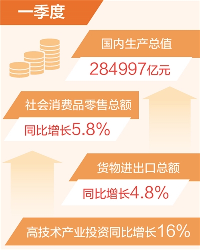 國內(nèi)需求逐步擴(kuò)大。一季度,社會消費品零售總額同比增長5.8%,服務(wù)零售額保持兩位數(shù)增長。一季度,固定資產(chǎn)投資同比增長5.1%,與上年全年持平。