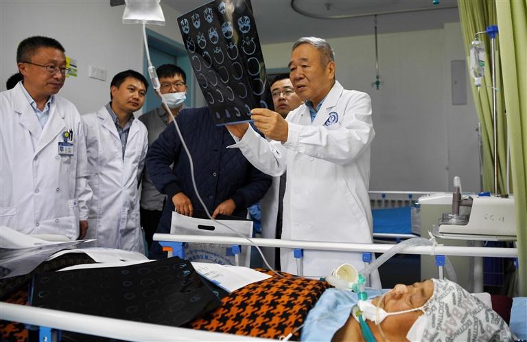 配圖:中國科學院院士、首都醫(yī)科大學附屬北京天壇醫(yī)院神經(jīng)外科學中心主任醫(yī)師趙繼宗(后右一)在自治區(qū)第二人民醫(yī)院為患者會診。 新華社記者 張汝鋒 攝