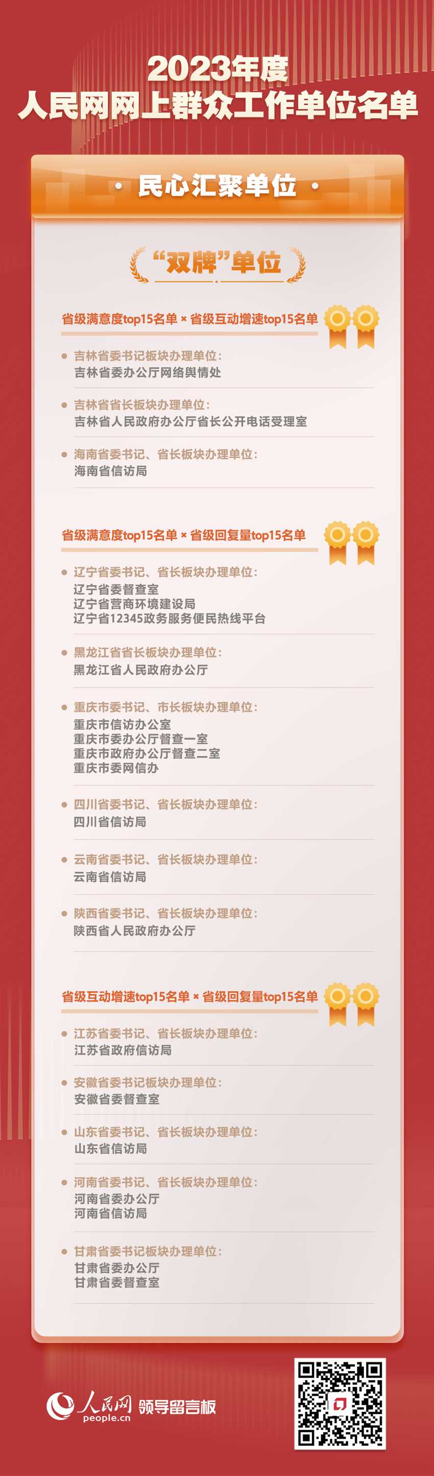 此次公布的名單綜合全國(guó)各地區(qū)各部門各單位近一年來的滿意度、互動(dòng)增速、回復(fù)量等指數(shù),著重突出各地區(qū)各部門各單位依托人民網(wǎng)“領(lǐng)導(dǎo)留言板”開展網(wǎng)上群眾工作情況,選出2023年度人民網(wǎng)網(wǎng)上群眾工作“民心匯聚單位”“實(shí)干擔(dān)當(dāng)單位”“匯智為民單位”和“活力奮進(jìn)單位”。