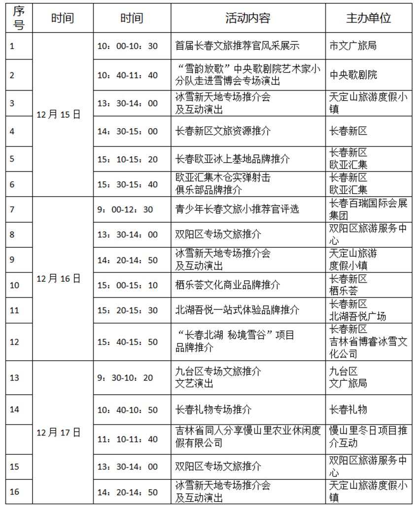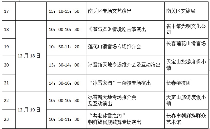另外,12月15—19日,3號館—冰雪長春主題館各個(gè)時(shí)間段都有演出和推介活動,詳情如下: