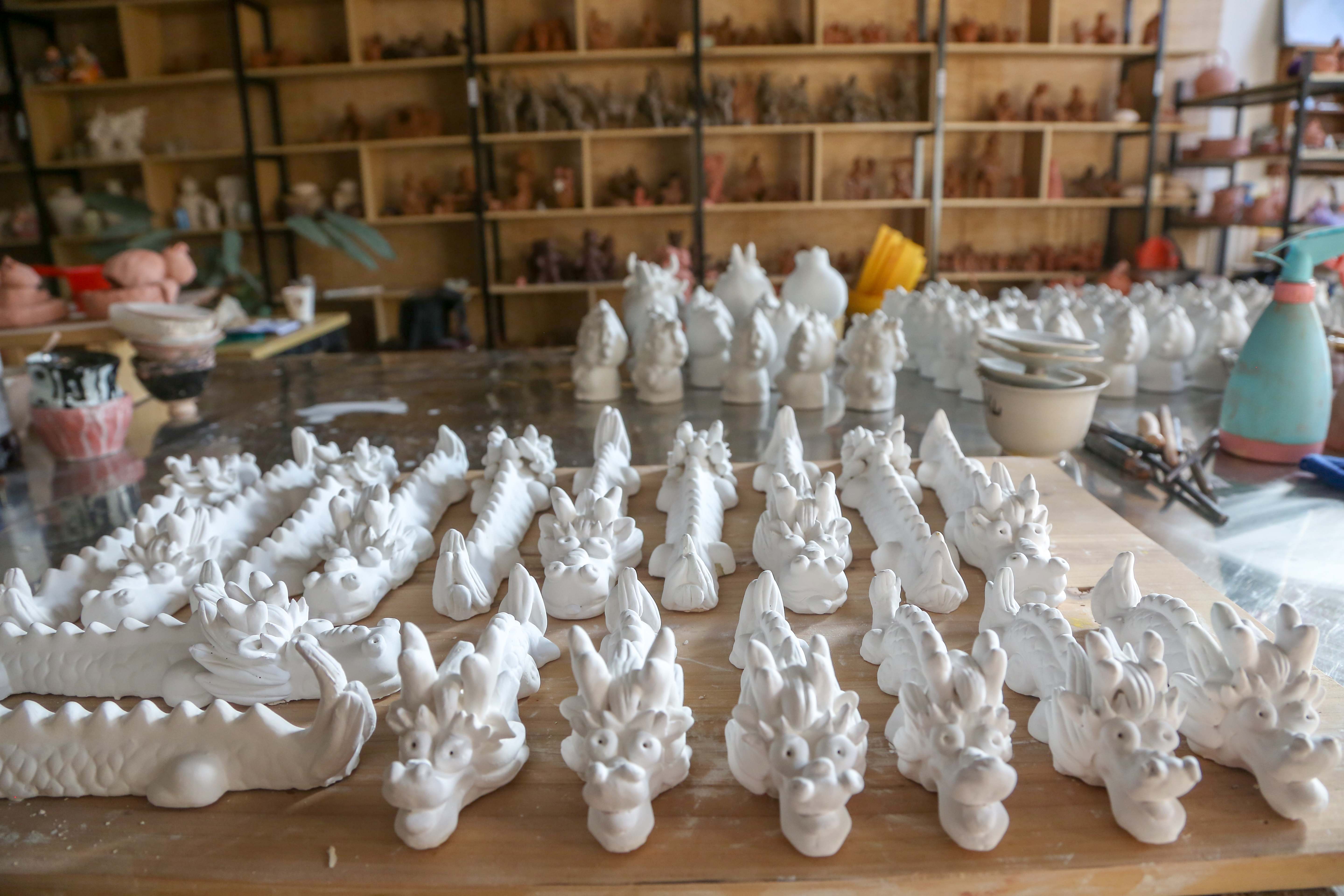 “這件泥塑取名‘一條好龍’,寓意新的一年萬(wàn)事順?biāo)?;這件叫‘大嘴龍’,寓意風(fēng)調(diào)雨順;這是十二生肖龍……”隨著龍年春節(jié)的臨近,史月明創(chuàng)作了一系列以龍為主題的泥塑作品。