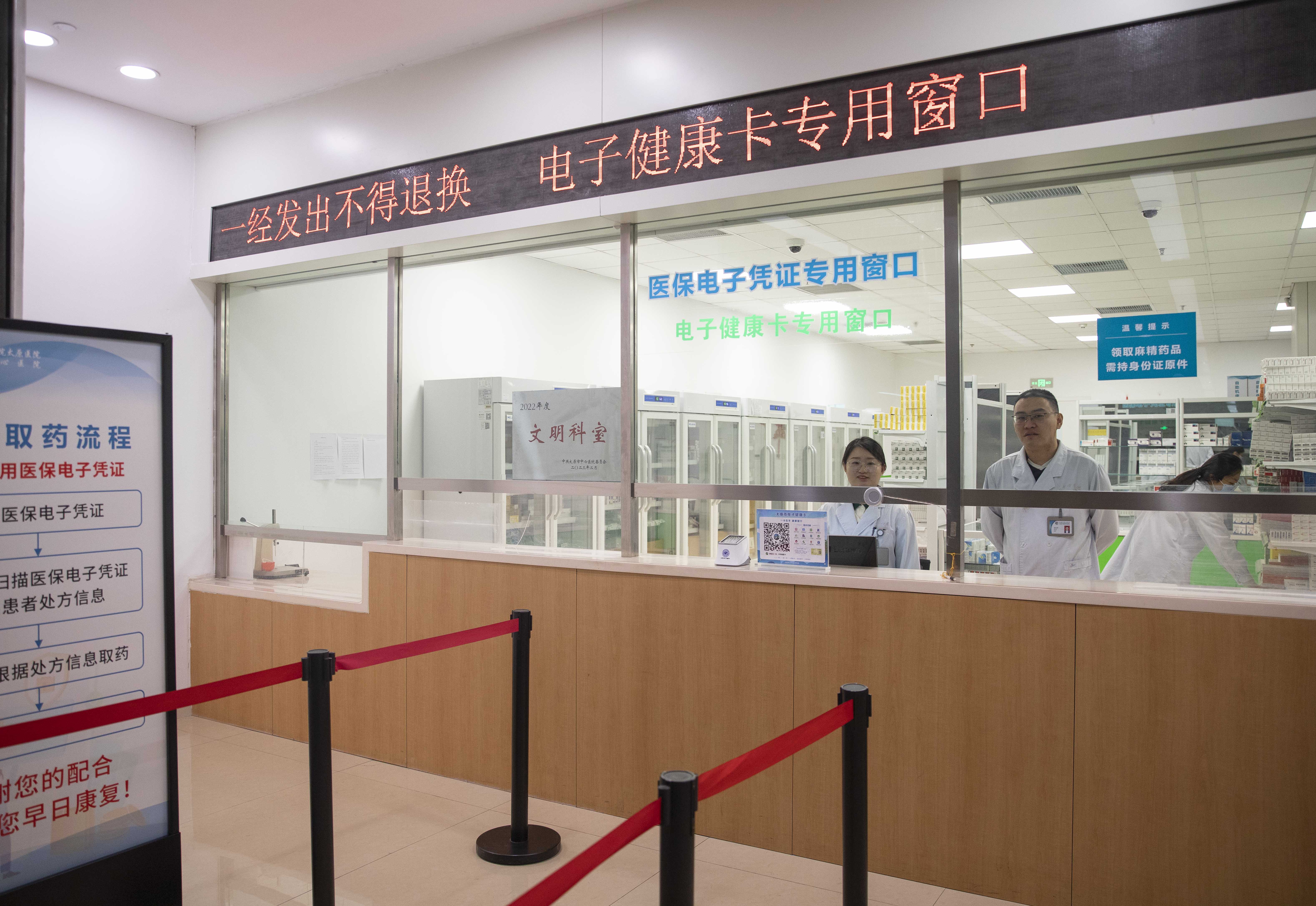 北大醫(yī)院太原醫(yī)院(市中心醫(yī)院)汾東院區(qū)電子健康卡專用取藥窗口。人民網(wǎng)記者王帆攝