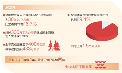 2023年,全國地級及以上城市PM2.5平均濃度為30微克/立方米,比2019年下降16.7%;全國地表水水質(zhì)優(yōu)良斷面比例達(dá)到89.4%,同比上升1.5個百分點(diǎn);超過300萬平方公里的陸域國土面積劃入生態(tài)保護(hù)紅線。