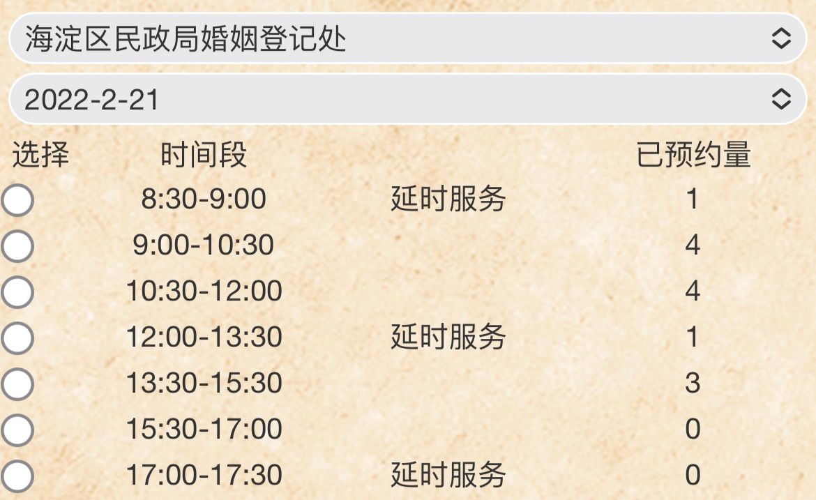 2020年9月起,北京推出政務(wù)“延時(shí)服務(wù)”,工作日除早晚提供半小時(shí)延時(shí)服務(wù)外,取消工作人員午休時(shí)間,周六延時(shí)工作一天。目前,全市婚登服務(wù)從8時(shí)30分持續(xù)至17時(shí)30分,全天分為7個(gè)預(yù)約時(shí)段。截至記者發(fā)稿時(shí),東城、西城、朝陽、海淀、順義、大興等多區(qū)僅剩兩個(gè)時(shí)段還可預(yù)約。