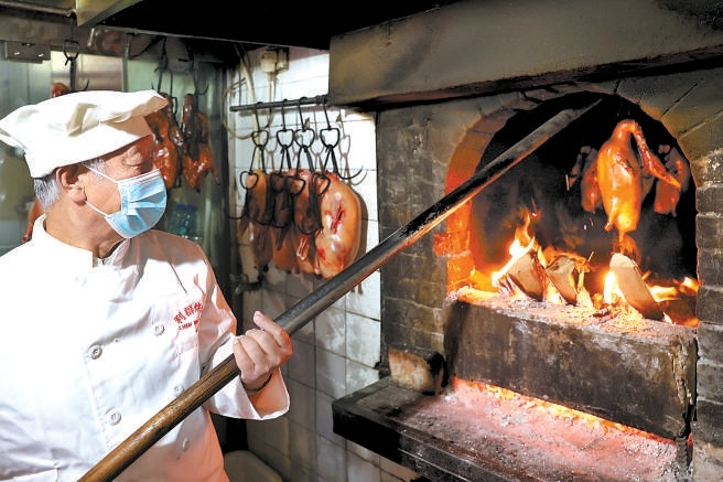 如今,年逾古稀的老張?jiān)缫堰^(guò)了退休的年齡,可他還不想“早退”?!皠e的我不行,我就會(huì)烤鴨子。只要身體允許,我想每天都工作?!笨粗t通通的爐火,張立群用鉤子一搭,又一只烤鴨出爐了。