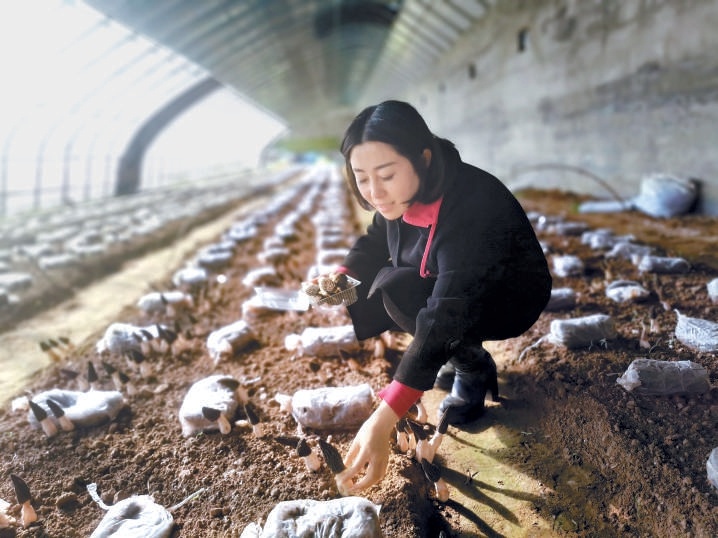 一頭利落的短發(fā),筆挺的身姿,明亮的笑容,39歲的董偉給人的第一印象有點(diǎn)颯。跟隨她來到位于懷柔區(qū)廟城鎮(zhèn)王史山村的溫室大棚,只見一個個小傘般的蘑菇頂蓋從土中鉆出來,看上去皺皺巴巴,筆直的菌柄呈象牙白色,村民們手持特制的小彎刀,嫻熟地將蘑菇從根部割下,不一會兒就裝滿了一筐?!斑@是羊肚菌,一種珍稀食用菌,聞起來有一股淡淡的香味。”說起蘑菇種植,董偉如數(shù)家珍,“羊肚菌是低溫菇,溫度一上來就不行了,收獲已經(jīng)接近尾聲?!?/p>
