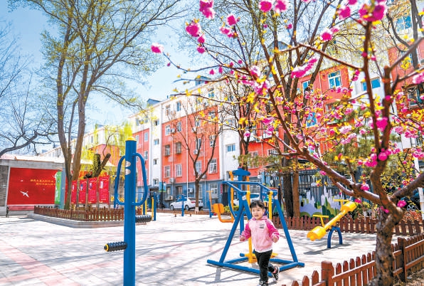 大興區(qū)興豐街道老小區(qū)黃村西里社區(qū)在居民的共同維護(hù)下,居住環(huán)境整潔舒適。圖為提升后的社區(qū)廣場(chǎng)上,小朋友正在樂(lè)享春光。本報(bào)記者 武亦彬攝