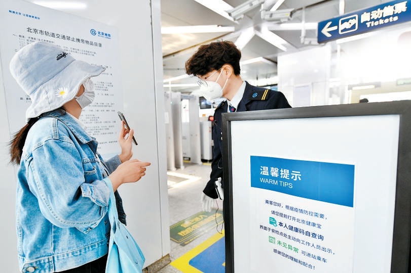 17日早晨,在北京地鐵5號線北苑路北站,地鐵安檢人員在進站安檢口檢查乘客健康碼。本報記者 鄧偉攝