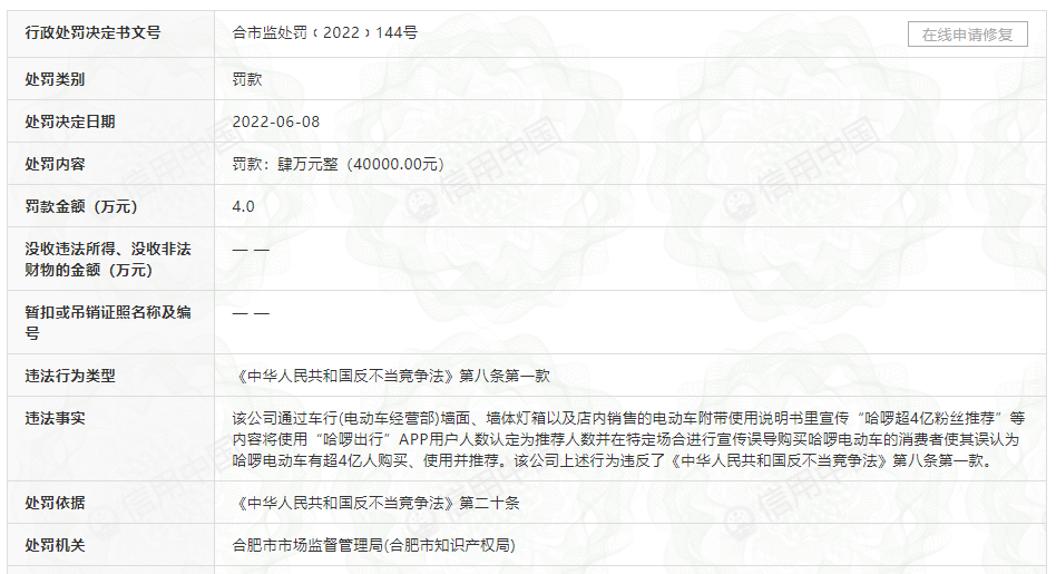 央廣網(wǎng)北京6月27日消息(記者于琦)因廣告宣傳誤導(dǎo)消費(fèi)者,哈啰關(guān)聯(lián)公司上海鈞哈網(wǎng)絡(luò)科技有限公司被處以40000元的罰款,處罰單位為合肥市市場監(jiān)督管理局(合肥市知識產(chǎn)權(quán)局)。