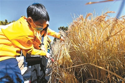 昨天上午,北京青年報記者來到先農壇,觀耕臺前的一畝三分地上,水稻已經成熟,稻穗在陽光下隨風搖曳,煥發(fā)出金燦燦的光澤,構成獨特的古都秋景。隨著主持人開鑼、小朋友們齊喊“豐收嘍”,收割儀式正式開始。在場嘉賓和10名小朋友一起收割第一鐮新稻子,寓意豐收碩果新開始。