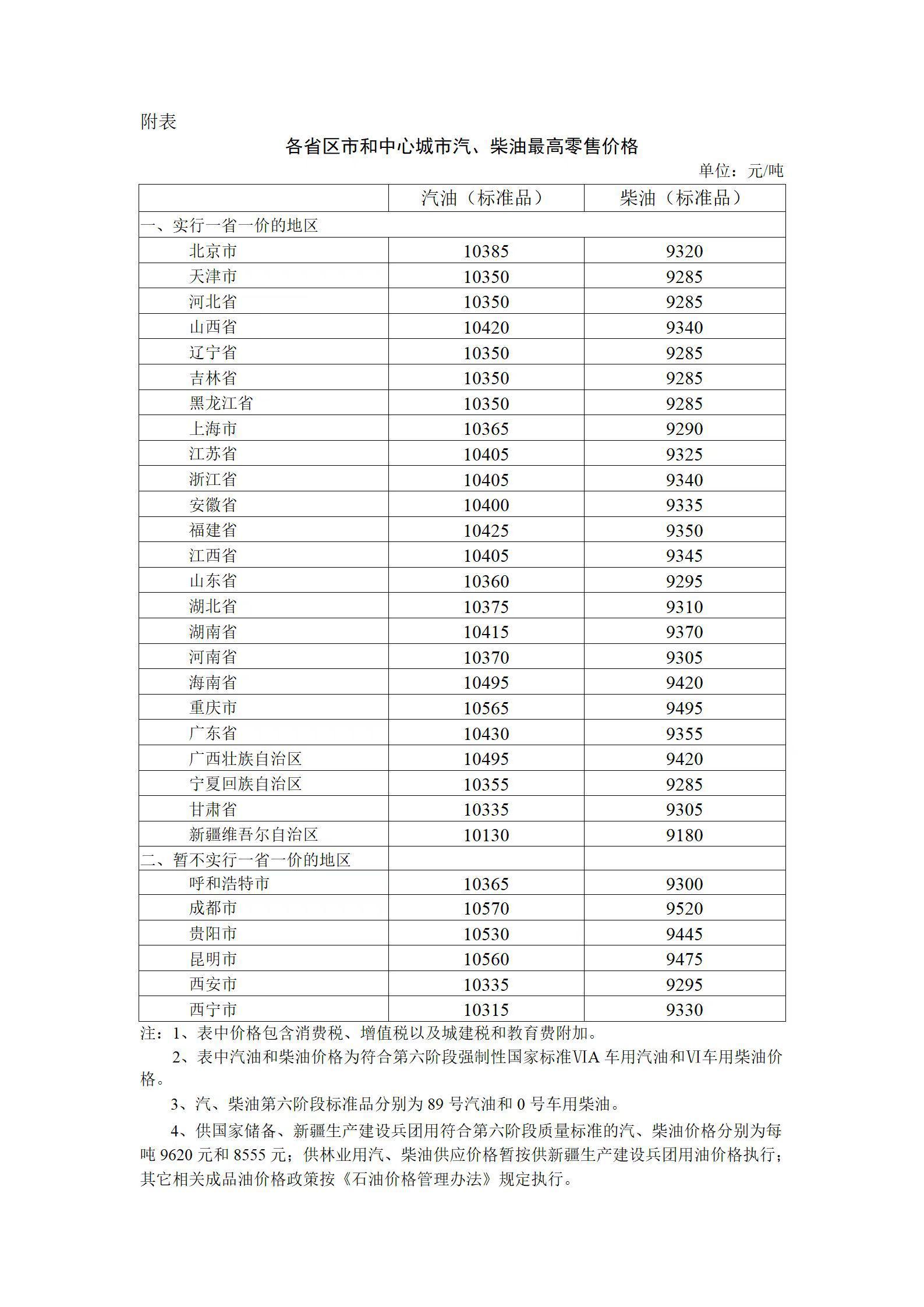 央廣網(wǎng)北京10月24日消息 據(jù)國(guó)家發(fā)展改革委官方網(wǎng)站消息,根據(jù)近期國(guó)際市場(chǎng)油價(jià)變化情況,按照現(xiàn)行成品油價(jià)格形成機(jī)制,自2022年10月24日24時(shí)起,國(guó)內(nèi)汽、柴油價(jià)格(標(biāo)準(zhǔn)品,下同)每噸分別提高185元和175元。調(diào)整后,各?。▍^(qū)、市)和中心城市汽、柴油最高零售價(jià)格見(jiàn)下表。相關(guān)價(jià)格聯(lián)動(dòng)及補(bǔ)貼政策按現(xiàn)行規(guī)定執(zhí)行。