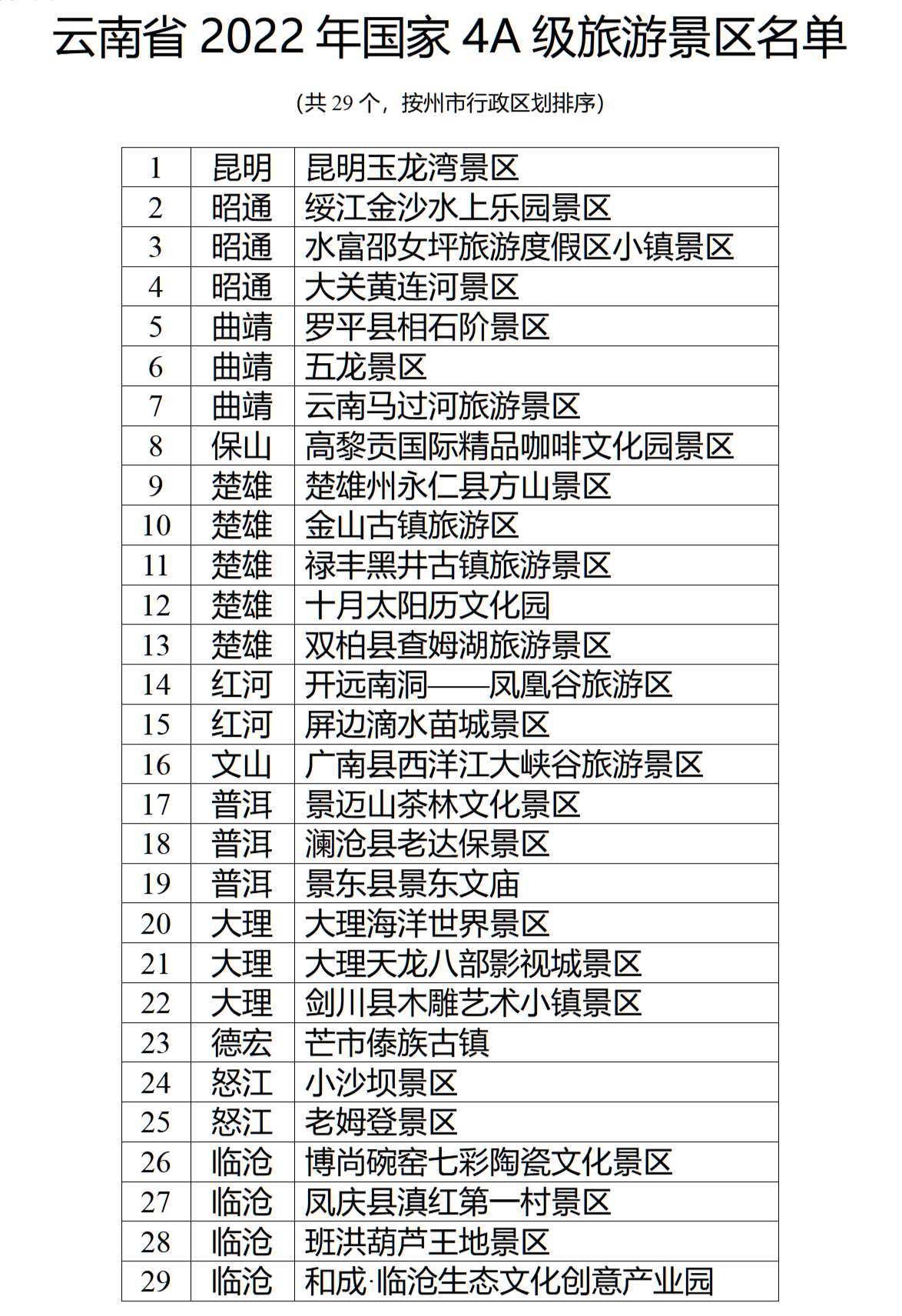 云南省2022年國家4A級旅游景區(qū)名單如下: