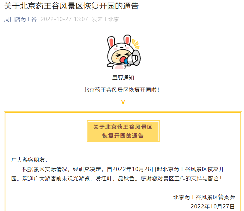 北京藥王谷風(fēng)景區(qū)將于10月28日恢復(fù)開園