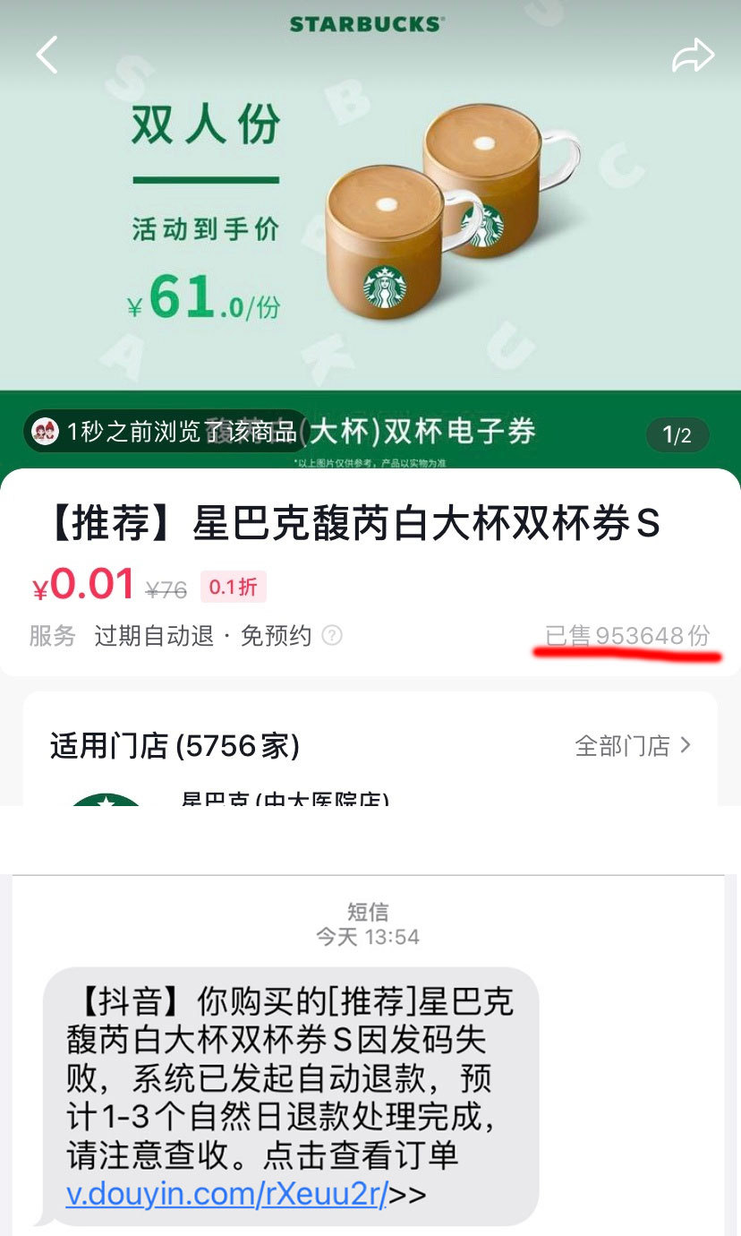 央廣網(wǎng)記者注意到,23日有多名網(wǎng)友在社交平臺(tái)微博反饋,星巴克近日在某平臺(tái)推出0.01元購2杯馥芮白咖啡券團(tuán)購活動(dòng),賣出95萬多單。但是不少消費(fèi)者表示搶券后,發(fā)現(xiàn)無法兌換,被星巴克自動(dòng)退款了。