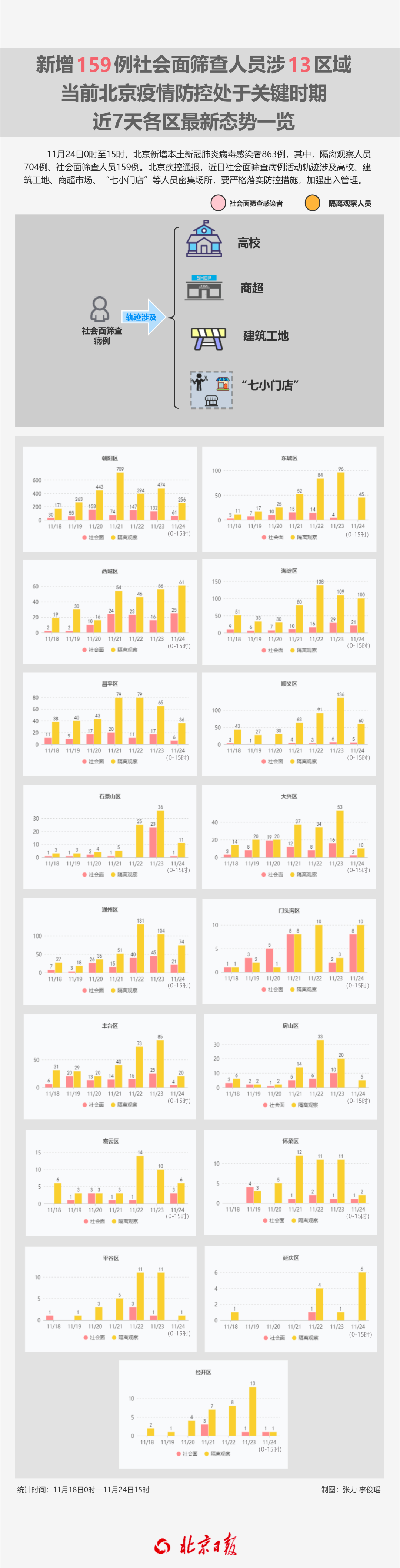 11月24日0時至15時,北京新增本土新冠肺炎病毒感染者863例,其中,隔離觀察人員704例、社會面篩查人員159例;朝陽區(qū)317例,海淀區(qū)121例,通州區(qū)95例,西城區(qū)86例,順義區(qū)65例,東城區(qū)45例,昌平區(qū)42例,豐臺區(qū)24例,門頭溝區(qū)18例,石景山區(qū)、大興區(qū)各12例,密云區(qū)9例,延慶區(qū)6例,房山區(qū)5例,懷柔區(qū)3例,經開區(qū)2例,平谷區(qū)1例;重型3例、普通型2例、輕型164例、無癥狀感染者694例。