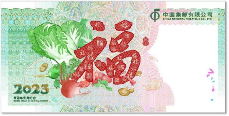 紀(jì)念券背面主景采用多個“?!弊值慕M合,寓意著新的一年福氣連連、福滿門。背景團(tuán)花中有玉兔搗藥的圖案,表達(dá)了疫情之下祈求健康、幸福的真摯愿望。白菜、蘿卜、蘑菇也都有著各自的深意,比如白菜諧音“百財(cái)”,且有清白之意;蘿卜在閩南方言叫“菜頭”,諧音彩頭;蘑菇則象征蓬勃向上的生命力量。這些看似普通的元素給人以親切之感,更寓意著源源不斷的財(cái)運(yùn)、好運(yùn)和幸運(yùn)。