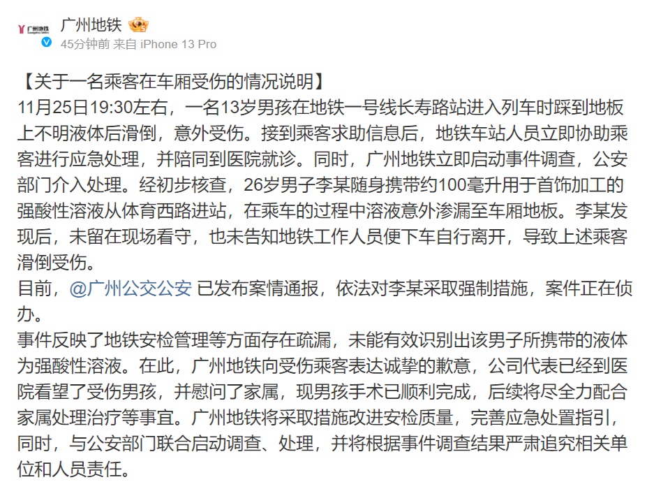 廣州地鐵方面表示,事件反映了地鐵安檢管理等方面存在疏漏,未能有效識別出該男子所攜帶的液體為強酸性溶液,向受傷乘客表達誠摯的歉意。廣州地鐵公司代表已經(jīng)到醫(yī)院看望了受傷男孩,并慰問了家屬,現(xiàn)男孩手術(shù)已順利完成,后續(xù)將盡全力配合家屬處理治療等事宜。