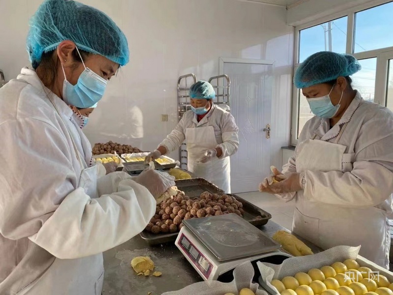 王桂琴正在跟村里的姐妹們包豆包(央廣網(wǎng)發(fā) 譚艷麗 攝)