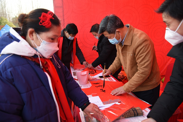 臺(tái)上歡歌載舞,臺(tái)下人頭攢動(dòng)。配鑰匙、法律援助咨詢、醫(yī)生義診、眼鏡修理等服務(wù),吸引了不少村民。書(shū)法家們現(xiàn)場(chǎng)書(shū)寫(xiě)幾百幅福字,將新年的美好祝愿贈(zèng)予村民。