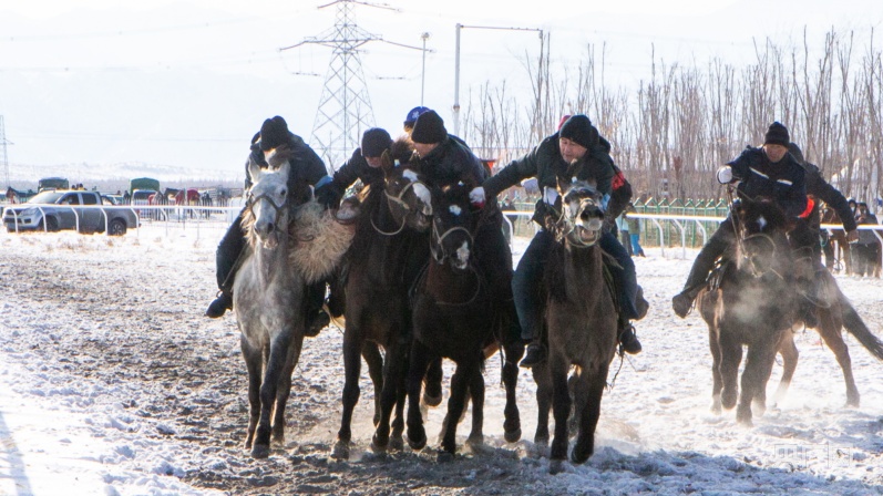 賽馬、斗雞、拔河、叼羊……賽場上選手激情澎湃,賽場下觀眾喝彩不斷。一匹匹風(fēng)馳電掣的駿馬激起雪霧陣陣,騎手們用精湛的馬技點燃寒冬里的激情,一場精彩紛呈的冰雪盛宴正式上演。