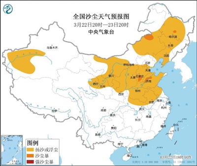 中央氣象臺昨日18時繼續(xù)發(fā)布沙塵暴黃色預(yù)警,受冷空氣大風(fēng)影響,預(yù)計22日20時至23日20時,新疆西南部、內(nèi)蒙古中西部和東南部、青海東北部、甘肅中部、寧夏、陜西中北部、山西、河北中南部、北京南部、天津中南部、山東、河南、安徽中北部、江蘇中北部、湖北北部、黑龍江中西部、吉林中西部、遼寧等地的部分地區(qū)有揚(yáng)沙或浮塵天氣,其中,內(nèi)蒙古中部偏北地區(qū)、黑龍江南部、河北西南部、山東西部局地有沙塵暴。