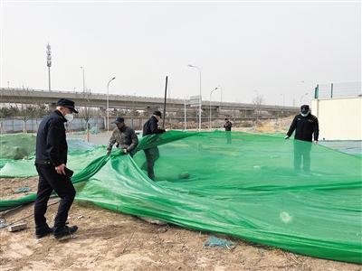 3月22日,石景山古城街道綜合行政執(zhí)法人員來到轄區(qū)內(nèi)工地,要求施工單位對裸露地面、渣土堆放場所及時苫蓋,施工期間進(jìn)行灑水降塵,渣土運輸車輛確保清潔到位上路不遺撒,從源頭杜絕揚(yáng)塵污染源的發(fā)生。新京報記者 浦峰 通訊員 王亞楠 攝