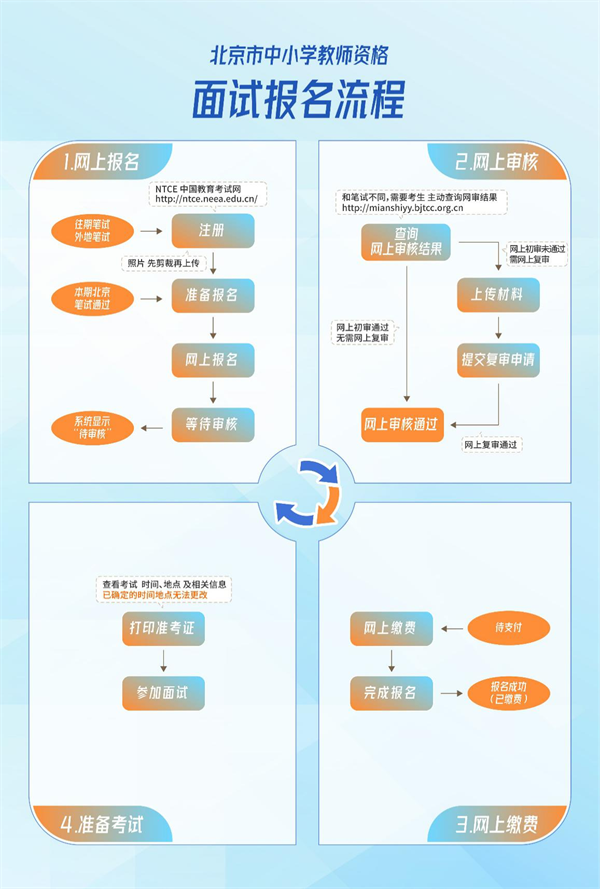 報(bào)考面試流程為:網(wǎng)上報(bào)名→網(wǎng)上審核→網(wǎng)上繳費(fèi)→查詢準(zhǔn)考證→參加面試→查詢成績。